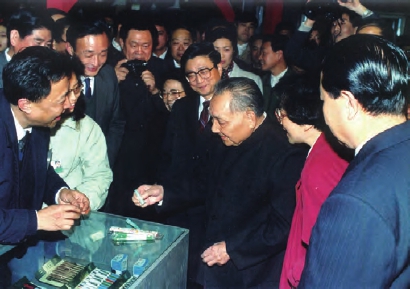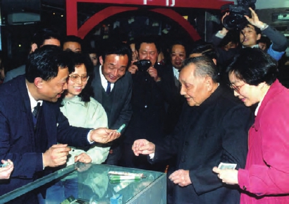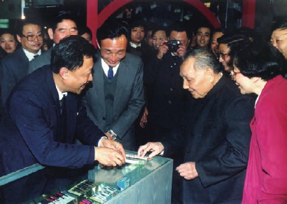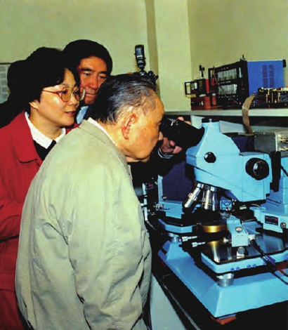 1992年2月10日上午,邓小平同志视察上海贝岭公司时,用放大镜观看3微米集成块后感叹地说:“高科技发展 真快!”。 张蔚飞摄影