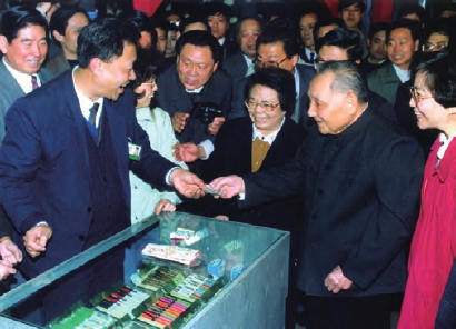 四:接着,小平同志递上一张人民币,买下了4封铅笔和4块橡皮。 稀客光顾大商场。1992年2月18日摄于上海中百一店 张蔚飞摄影