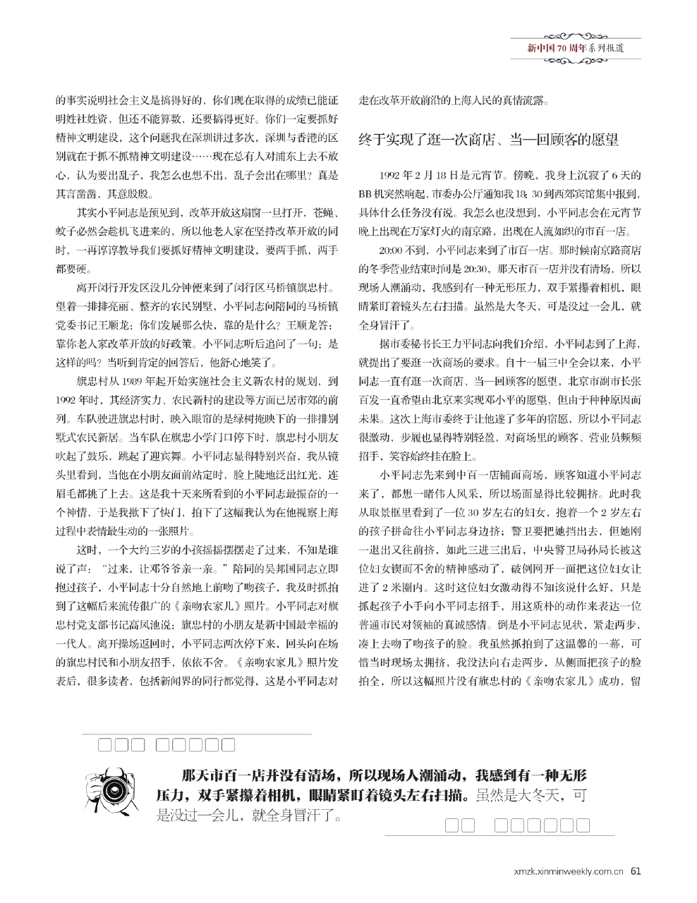 我有幸记录下这组珍贵的镜头。我感到,作为中国改革开放的总设计师,社会主义市场经济的倡导者,邓小平同志逛商场、当顾客有着深刻的含意。我一直为自己能拍下这个经典的历史瞬间而深感荣幸。这组照片中的第四幅,后来以《稀客光顾大商场》为题,在1992年度的中国新闻摄影年赛中拔得头筹,2013年10月,《稀客光顾大商场》入选中华全国新闻工作者协会主编的《中国百年新闻经典·摄影卷》,成为见证中国百年历史的百幅经典照片之一。