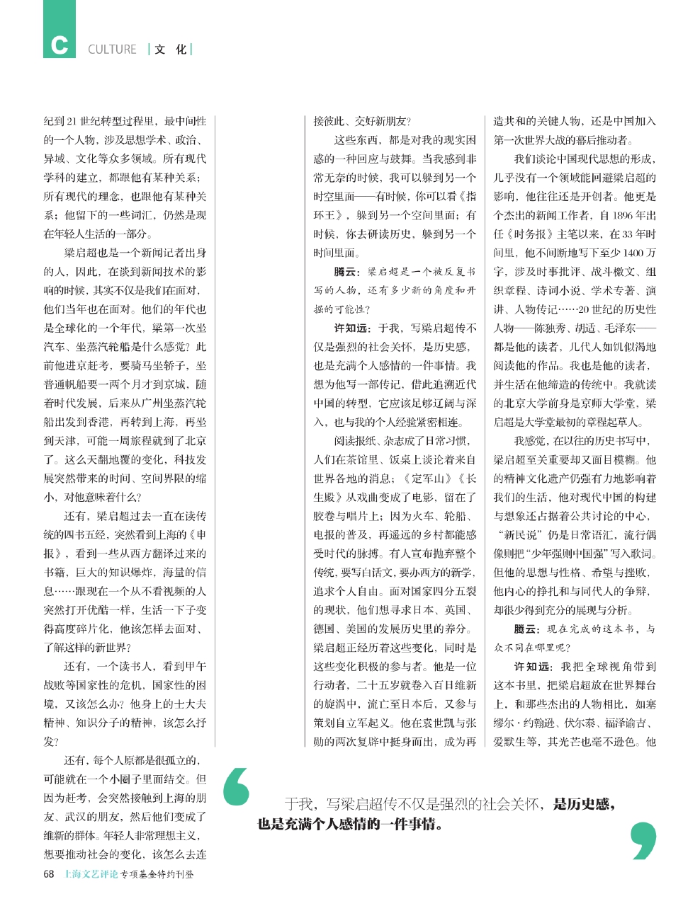 许知远:于我,写梁启超传不仅是强烈的社会关怀,是历史感,也是充满个人感情的一件事情。我想为他写一部传记,借此追溯近代中国的转型,它应该足够辽阔与深入,也与我的个人经验紧密相连。