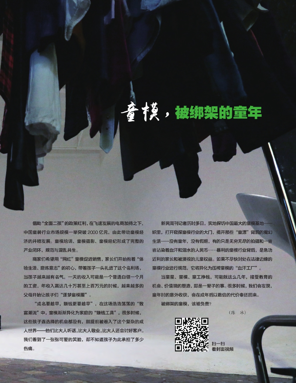 新民周刊记者历时多日,实地探访中国最大的童模基地——织里,打开窥探童模行业的大门,揭开那些“童漂”背后的魔幻生活——没有童年,没有假期,有的只是无穷无尽的拍摄和一沓沓沾染着血汗和泪水的人民币……暴利的童模行业背后,是急功近利的家长和被漠视的儿童权益。如果不尽快对处在法律边缘的童模行业进行规范,它将异化为压榨童模的“血汗工厂”。