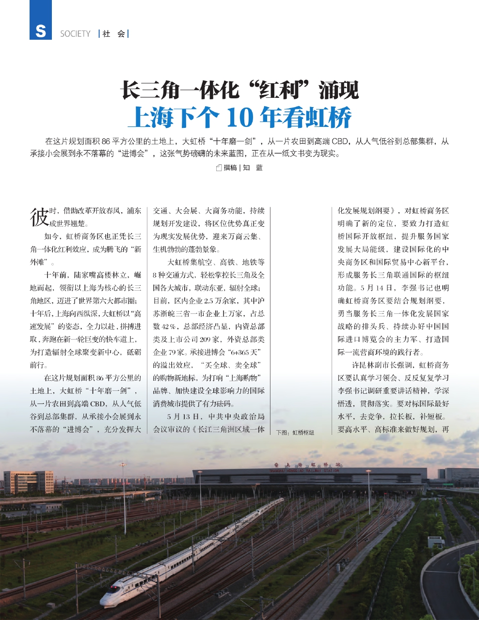 5月13日,中共中央政治局会议审议的《长江三角洲区域一体化发展规划纲要》,对虹桥商务区明确了新的定位,要致力打造虹桥国际开放枢纽,提升服务国家发展大局能级,建设国际化的中央商务区和国际贸易中心新平台,形成服务长三角联通国际的枢纽功能。5月14日,李强书记也明确虹桥商务区要结合规划纲要,勇当服务长三角一体化发展国家战略的排头兵、持续办好中国国际进口博览会的主力军、打造国际一流营商环境的践行者。