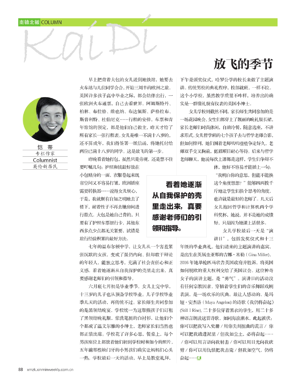 女儿学校最后一天是“演讲日”,包括发奖仪式和十三年级的毕业典礼。他们请来的主题演讲的嘉宾,是出生在英属圭亚那的吉娜·米勒(Gina M iller),2016年她单枪匹马状告英国政府并胜诉,将英国如何脱欧的重大权利交给了英国议会。这位神奇女子的演讲主题,是“勇气”。演讲日的活动没有任何宗教因素,穿插着学生们的音乐舞蹈戏剧表演,是一场欢乐的庆典。最让人感动的,是玛娅·安杰洛(Maya Angelou)的诗歌《我仍将奋起》(Still I Rise), 二十多位穿着黑衣的学生,用二十多种语言朗读这首诗歌,如同海浪潮水,此起彼伏:你可以把我写入史册/用你尖刻扭曲的谎言/ 你可以把我踏进泥里/但我如尘土,必将奋起……/你可以用言语向我射击/你可以用目光向我砍劈/你可以用仇恨把我击毙/但我如空气,仍将奋起……