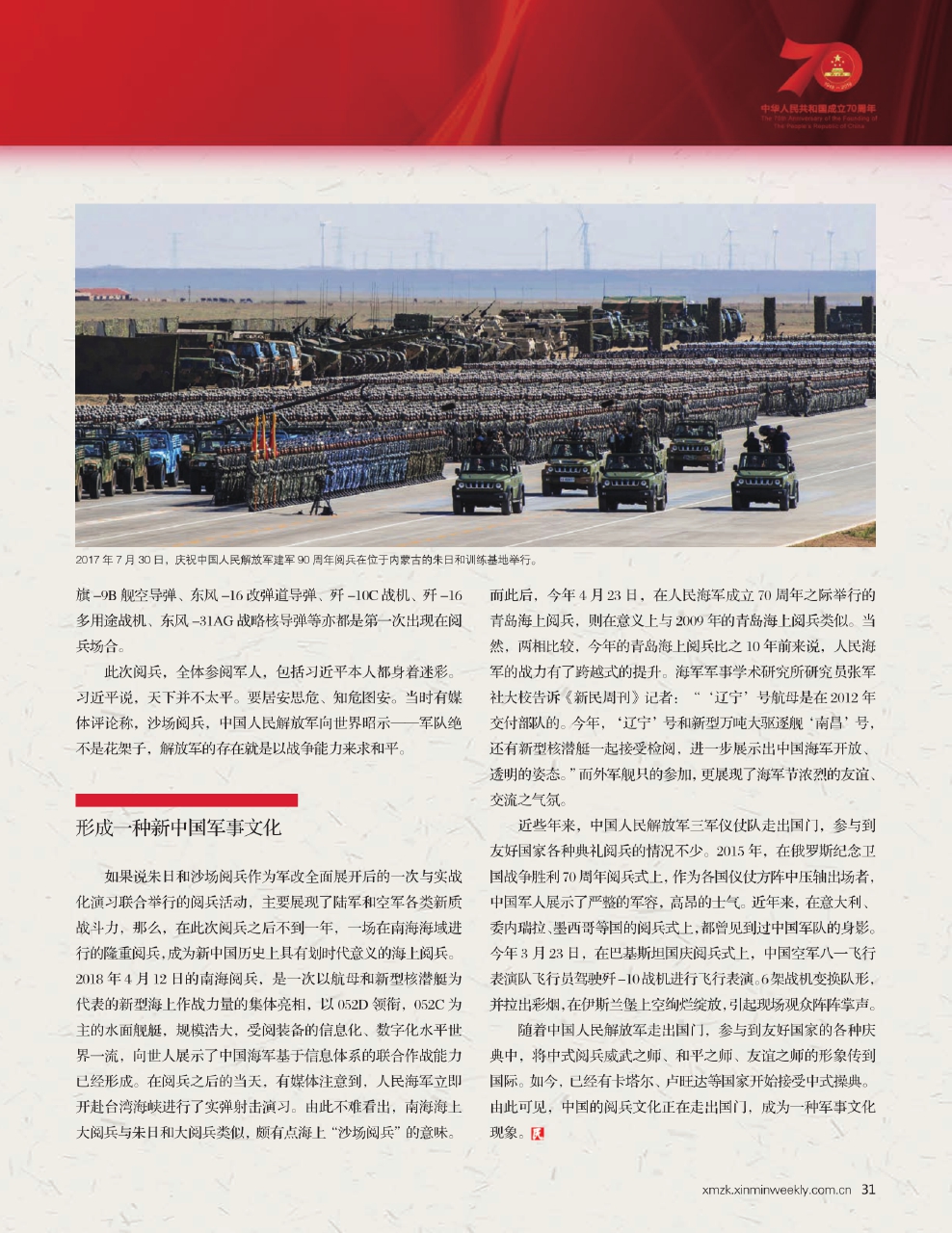 回首70年,一路前行,新中国的大阅兵,不仅规模逐次加大,展示的武器装备越来越先进,且国产装备越来越多,甚至采用全国产装备,更值得一提的是——大阅兵不仅仅只在天安门广场举行了。从演兵场上,到祖国的海疆,都出现了人民子弟兵接受检阅的身影。甚至在友好国家的典礼上,也出现了中国军人的正步。中国装备出口海外,中式操典被外军采用……中国大阅兵,展现了新中国的一种新中华文化,积淀多年,在2019年的金秋又有了最新的展现。