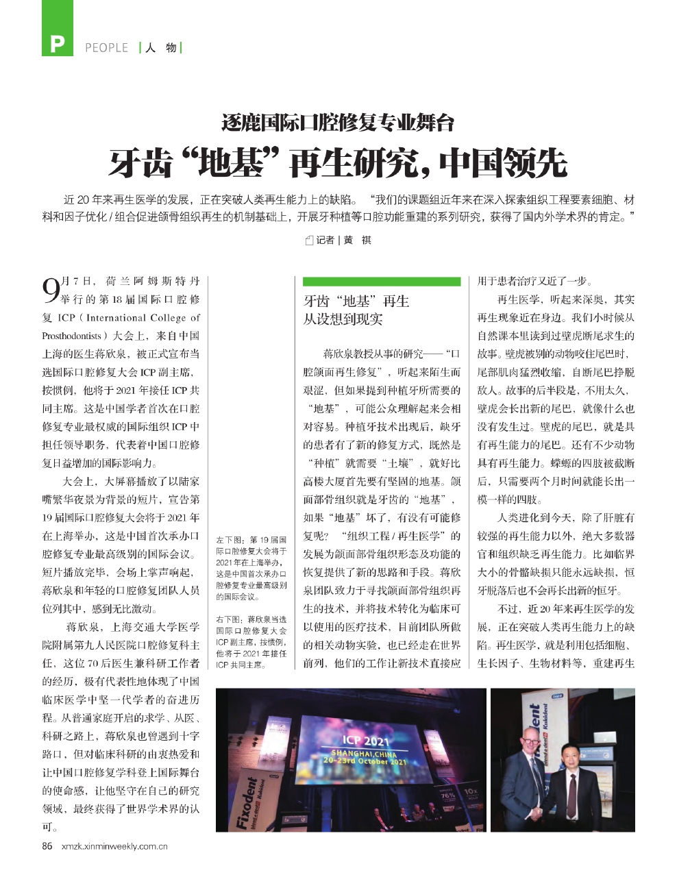 上图:蒋欣泉教授带领的团队以勤奋的工作和创新的思维,让中国的口腔修复-再生医学专业,站上世界舞台。