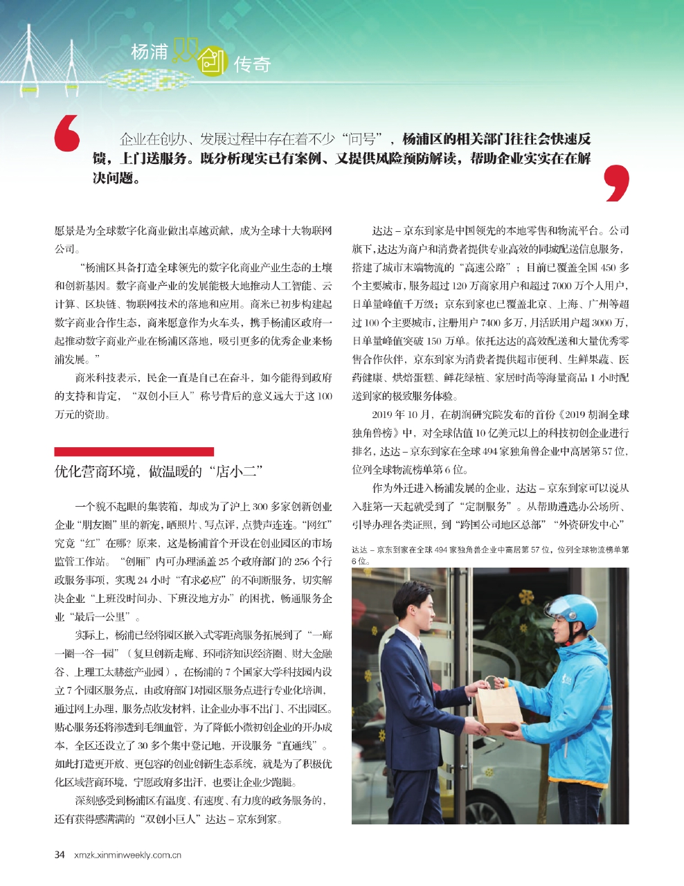 深刻感受到杨浦区有温度、有速度、有力度的政务服务的,还有获得感满满的“双创小巨人”达达-京东到家。