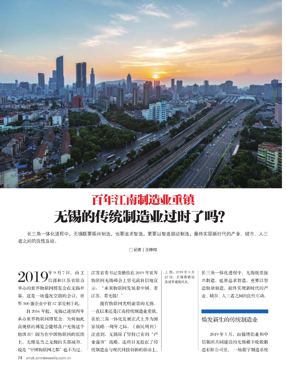 拥有物联网光明前景的无锡,一直以来还是江南传统制造业重镇。在长三角一体化发展正式上升为国家战略一周年之际,《新民周刊》注意到,无锡除了坚持已有的“产业强市”战略,还将目光投在了传统制造业与现代科技创新的联动上。