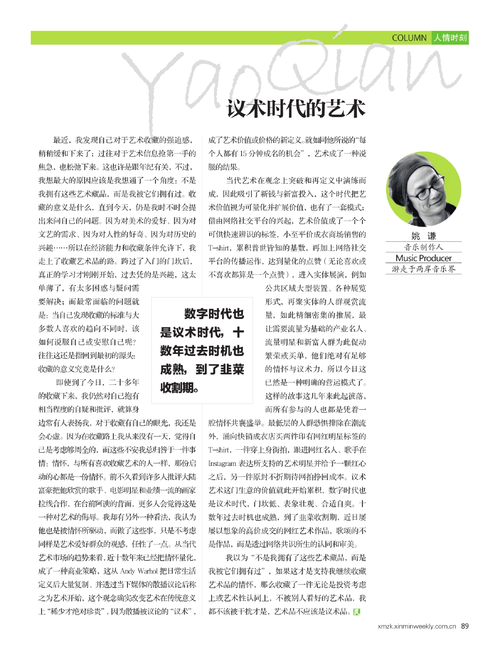 当代艺术在观念上突破和再定义中演练而成,因此吸引了新钱与新富投入,这个时代把艺术价值视为可量化并扩展价值,也有了一套模式;借由网络社交平台的兴起,艺术价值成了一个个可供快速辨识的标签,小至平价成衣商场销售的T-shirt,累积普世皆知的基数,再加上网络社交平台的传播运作,达到量化的点赞(无论喜欢或不喜欢都算是一个点赞),进入实体展演,例如公共区域大型装置、各种展览形式,再聚实体的人群观赏流量,如此精细密集的推展,最让需要流量为基础的产业名人、流量明星和新富人群为此促动繁荣或买单,他们绝对有足够的情怀与议术力,所以今日这已然是一种明确的营运模式了。这样的故事这几年来此起彼落,而所有参与的人也都是凭着一腔情怀共襄盛举。最低层的人群恐惧排除在潮流外,涌向快销成衣店买两件印有网红明星标签的T-shirt,一件穿上身街拍,跟进网红名人、歌手在Instagram表达所支持的艺术明星并给予一颗红心之后,另一件原封不折期待网拍挣回成本。议术艺术这门生意的价值就此开始累积,数字时代也是议术时代,门坎低、表象壮观、合适自爽。十数年过去时机也成熟,到了韭菜收割期,近日屡屡以想象的高价成交的网红艺术作品,歌颂的不是作品,而是透过网络共识所生的认同和审美。
