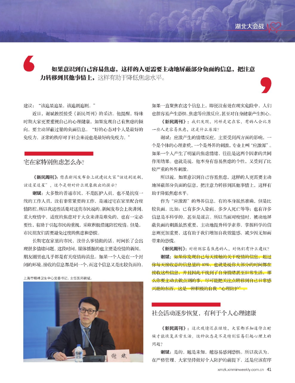 近日,谢斌教授接受《新民周刊》的采访。他提醒,特殊时期大家更要重视自己的心理健康,如果发现自己有焦虑的倾向,要主动屏蔽过量的负面信息。“好的心态对个人是最好的免疫力,正常的秩序对于社会来说也是最好的免疫力。”