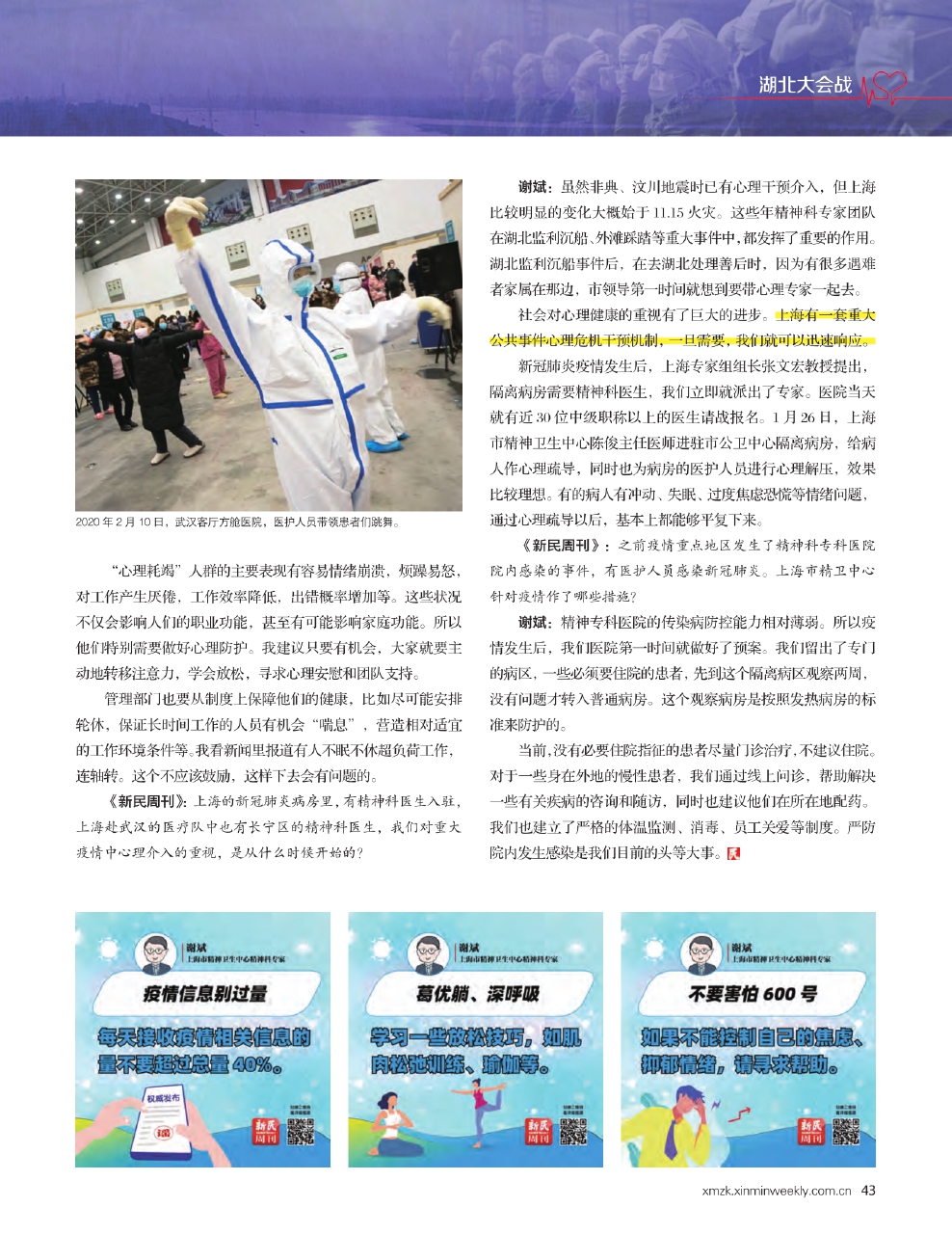 《新民周刊》:上海的新冠肺炎病房里,有精神科医生入驻,上海赴武汉的医疗队中也有长宁区的精神科医生,我们对重大疫情中心理介入的重视,是从什么时候开始的?