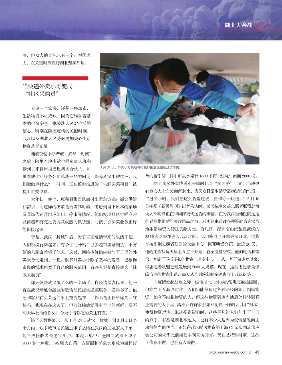 向疫情发起总攻之际,纵使湖北与外界的常规交通被隔断,但在当下互联网时代,人们仍能够通过各种路径向湖北捐助物资。如今不缺捐物资的人,但这些物资到达当地后怎样转到真正需要的人手里,离不开许许多多如邓明锋一样的人。因“封城”使得物资运输、配送受到影响时,这些平凡的人们伸出了自己的双手。有些是湖北本地人,也有不少人是因为疫情暴发而主动前往当地帮忙。正如在武汉配送物资的上海CJ荣庆物流供应链公司的宋华此前接受本刊采访所言:现在是特殊时期,这些工作我不做,也会有人来做。