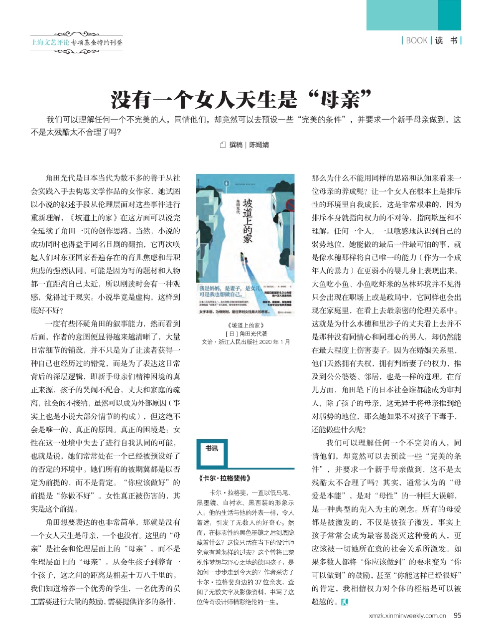 角田光代是日本当代为数不多的善于从社会实践入手去构思文学作品的女作家,她试图以小说的叙述手段从伦理层面对这些事件进行重新理解,《坡道上的家》在这方面可以说完全延续了角田一贯的创作思路。当然,小说的成功同时也得益于同名日剧的翻拍,它再次唤起人们对东亚国家普遍存在的育儿焦虑和母职焦虑的强烈认同。可能是因为写的题材和人物都一直距离自己太近,所以刚读时会有一种观感,觉得过于现实。小说毕竟是虚构,这样到底好不好?