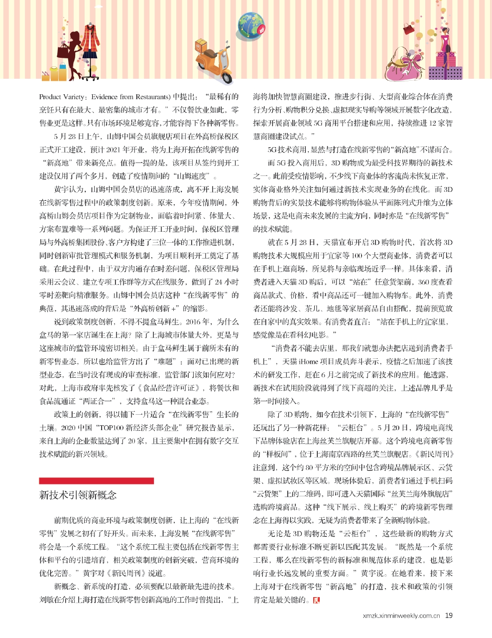 这一切,与这座城市长期以来积攒的商业基础密不可分。“上海拥有广阔开放的消费市场,一批资源配置能力强的在线新零售领军企业,以及开放创新的政策制度。这三者,共同构成上海开拓在线新零售‘新高地’的三大优势条件。”黄宇对《新民周刊》表示。