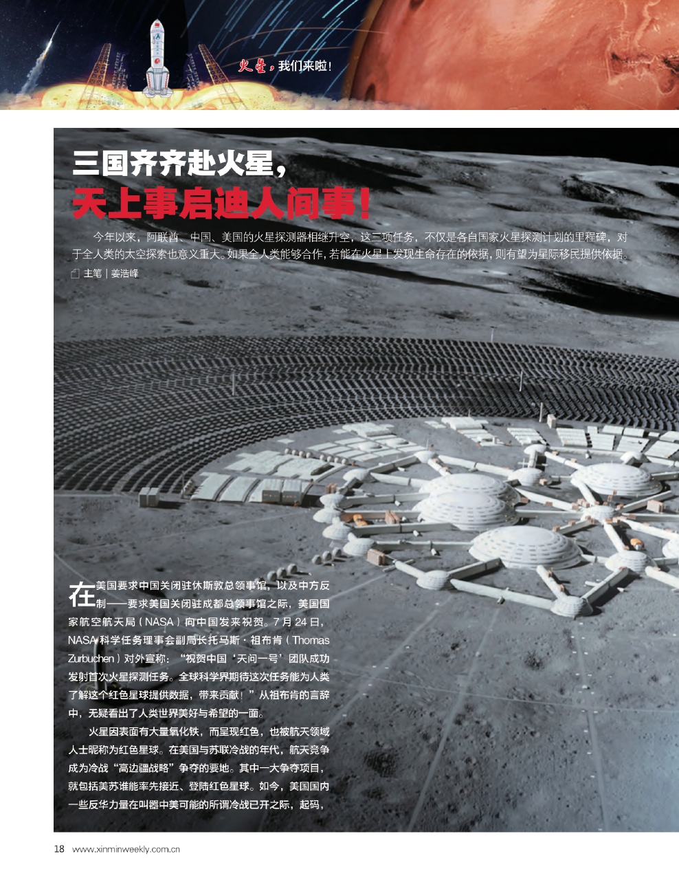 在美国要求中国关闭驻休斯敦总领事馆,以及中方反制——要求美国关闭驻成都总领事馆之际,美国国家航空航天局(NASA)向中国发来祝贺。7 月24 日,NASA 科学任务理事会副局长托马斯·祖布肯(Thomas Zurbuchen)对外宣称:“祝贺中国‘天问一号’团队成功发射首次火星探测任务。全球科学界期待这次任务能为人类了解这个红色星球提供数据,带来贡献!” 从祖布肯的言辞中,无疑看出了人类世界美好与希望的一面。