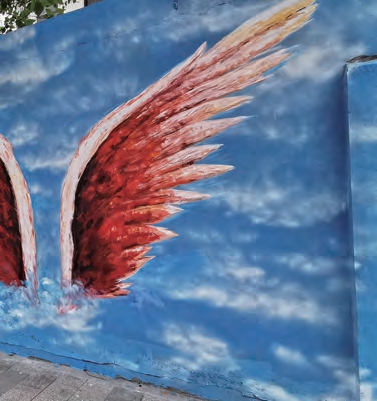 但今年初,面向街面的59 号和60 号居民楼外墙上,突然“长出”一面巨幅涂鸦。画面上,白鸽展翅高飞,留下这枝繁叶茂、美丽的花朵们......15 种以上的色彩让它变得时髦且醒目。过路的人们忍不住掏出手机,记录下这幅露天“艺术品”,老旧小区因一幅墙绘变成新的都市景观。