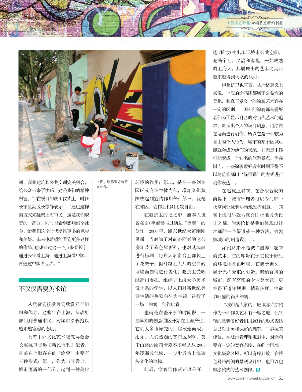 上海中外文化艺术交流协会会长赵抗卫告诉《新民周刊》记者,目前在上海存在的“涂鸦” 主要有三种形式:第一,作为市容设计、城市更新的一部分,起到一种美化环境的作用;第二,是在一些创业园区或商业主体内部,增加文化氛围或起到宣传作用等;第三,就是在郊区,创作上相对比较自由。