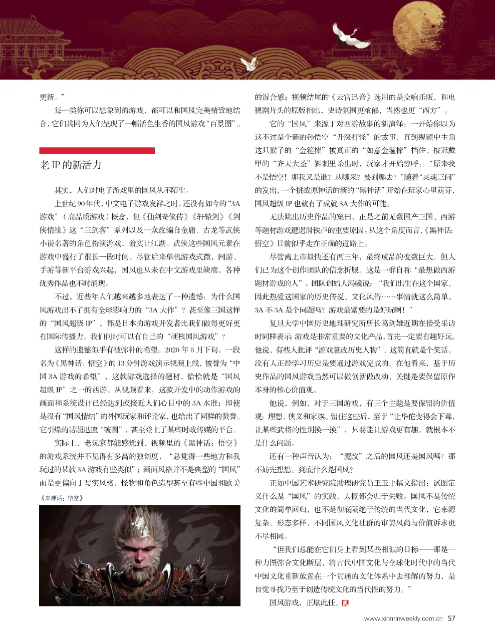 这样的遗憾似乎有被弥补的希望。2020 年8 月下旬,一段名为《黑神话:悟空》的13 分钟游戏演示视频上线,被誉为“中国3A 游戏的希望”,这款游戏选择的题材,恰恰就是“国风超级IP” 之一的西游。从视频看来,这款开发中的动作游戏的画面和系统设计已经达到或接近人们心目中的3A 水准;即使是没有“国风情结”的外国玩家和评论家,也给出了同样的赞誉。它引爆的话题迅速“破圈”,甚至登上了某些时政传媒的平台。