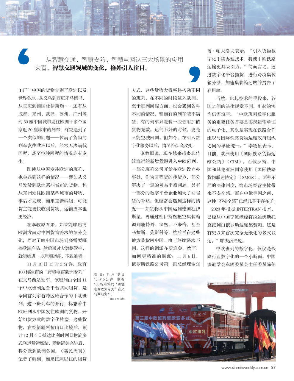 右图:11 月18 日15 时5 分许, 载有100 标准箱的“跨境电商欧洲专列” 在义乌西站发车。 摄影/ 马锦标