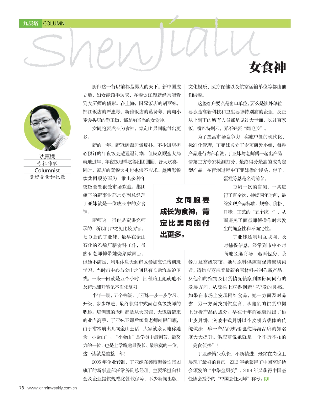 丁亚妹博采众长,不断精进,最终在岗位上展现了最好的自己。2013 年她获得了中国烹饪协会颁发的“中华金厨奖”,2014 年又获得中国烹饪协会授予的“中国烹饪大师” 称号。