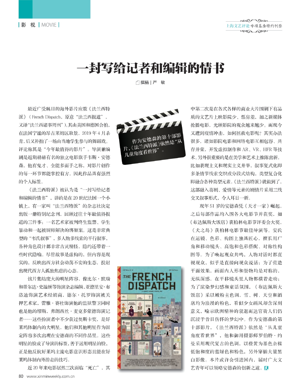 最近广受瞩目的海外影片应数《法兰西特派》(French Dispatch,原意“法兰西报道”,又译“法兰西诸事周刊”)。其由美国和德国合拍,在法国宁谧的昂古莱姆区取景,2019年4月杀青,后又补拍了一场由当地学生参与的舞蹈戏。评论称其是“今年最值得的影片”。导演兼编剧是近期赫赫有名的独立电影旗手韦斯·安德森,他有鬼才、全能多面手之称,对影片创作的每一环节都能掌控有方,因此作品具有强烈的个人标签。