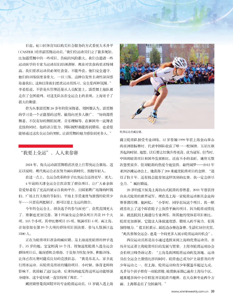两位运动员都是自小通过选拔来到上海的优秀运动员,亲历并见证着上海轮滑项目的发展与繁荣。上海市轮滑运动协会会长顾卫峰告诉记者:“上海是我国轮滑运动的发源地,运动员在全运会上激情比拼的同时,轮滑也已成为沪上最普及的青少年运动之一。在上海,轮滑运动的青少年覆盖率超过九成,几乎每个孩子都有一双轮滑鞋。轮滑俱乐部已遍布上海每个区,越来越多的中小学校在开设轮滑兴趣班。在大众和专业两个方面,上海都走在了全国前列。”