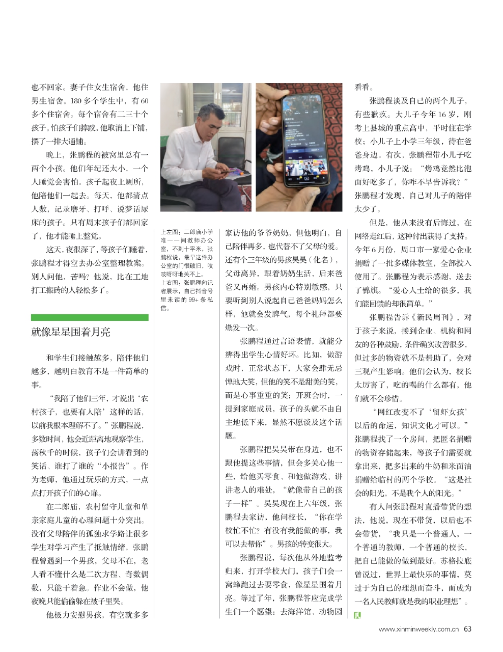 教育是没有任何技巧的,最好的教育是陪伴,孩子的成长恰恰在每一节课中,每一次玩耍中,每一次沟通当中。张鹏程希望,在细碎的言传身教中,能让这些孩子“身处沟渠,心向明月”。而他自己,就像一轮明月,照耀并守护着孩子们。
