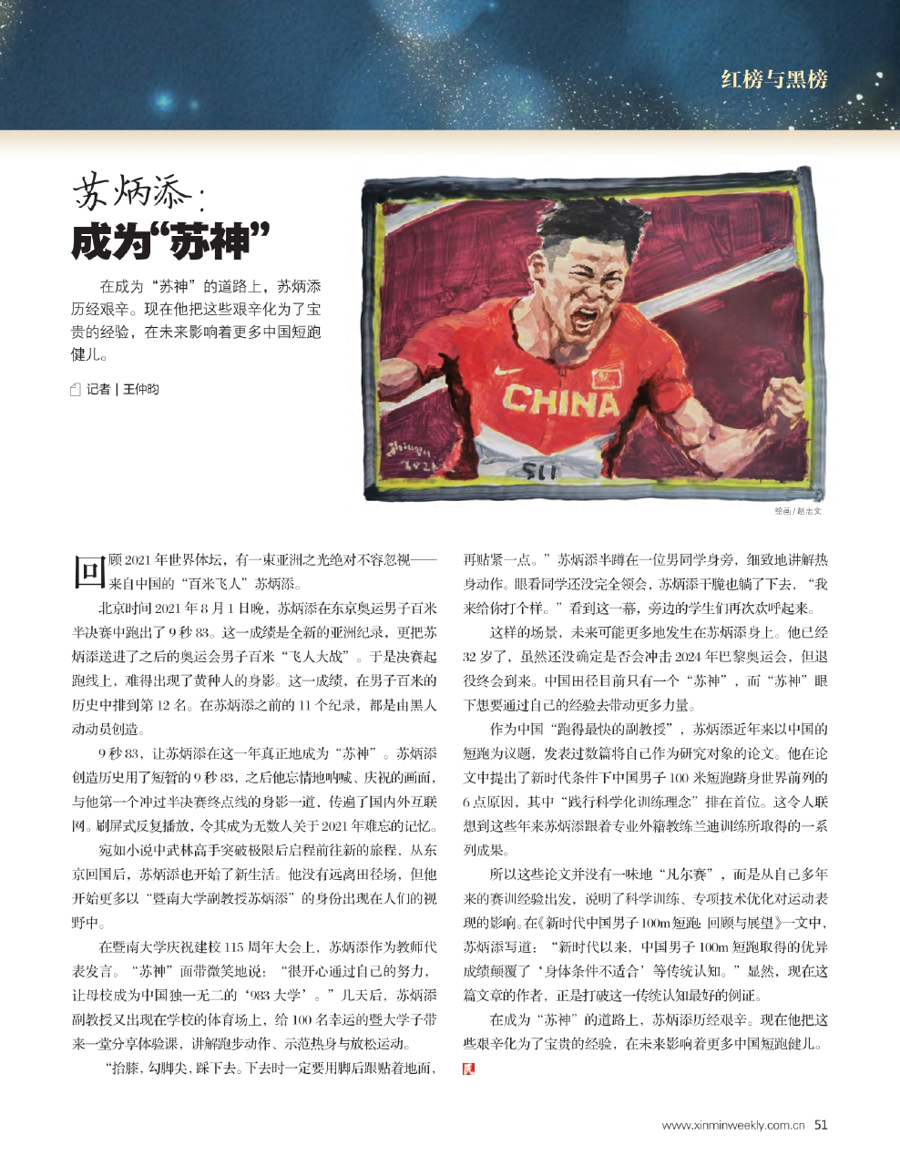9秒83,让苏炳添在这一年真正地成为“苏神”。苏炳添创造历史用了短暂的9秒83,之后他忘情地呐喊、庆祝的画面,与他第一个冲过半决赛终点线的身影一道,传遍了国内外互联网。刷屏式反复播放,令其成为无数人关于2021年难忘的记忆。