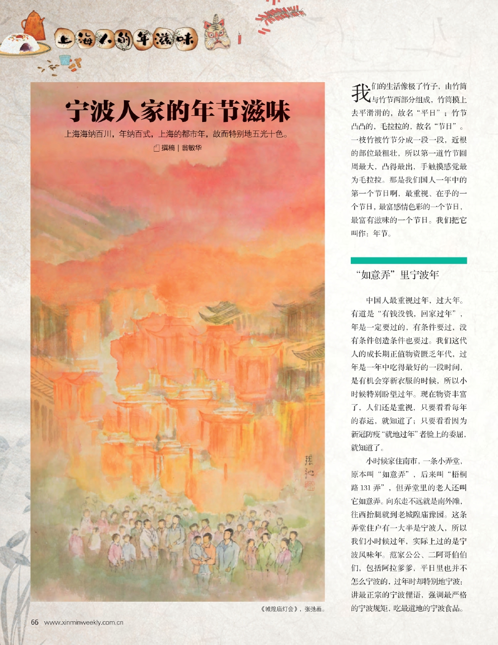 小时候家住南市,一条小弄堂,原本叫“如意弄”,后来叫“梧桐路131弄”,但弄堂里的老人还叫它如意弄。向东走不远就是南外滩,往西抬腿就到老城隍庙豫园。这条弄堂住户有一大半是宁波人,所以我们小时候过年,实际上过的是宁波风味年。范家公公、二阿哥伯伯们,包括阿拉爹爹,平日里也并不怎么宁波的,过年时却特别地宁波:讲最正宗的宁波俚语,强调最严格的宁波规矩,吃最道地的宁波食品。