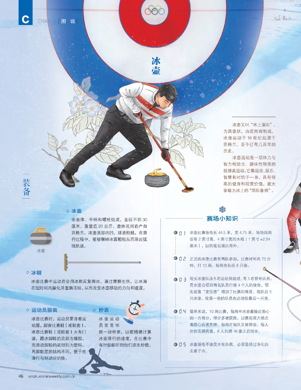 正式的冰壶比赛有两队参加,比赛时间共73分钟,打10局,每局各队投8只壶。