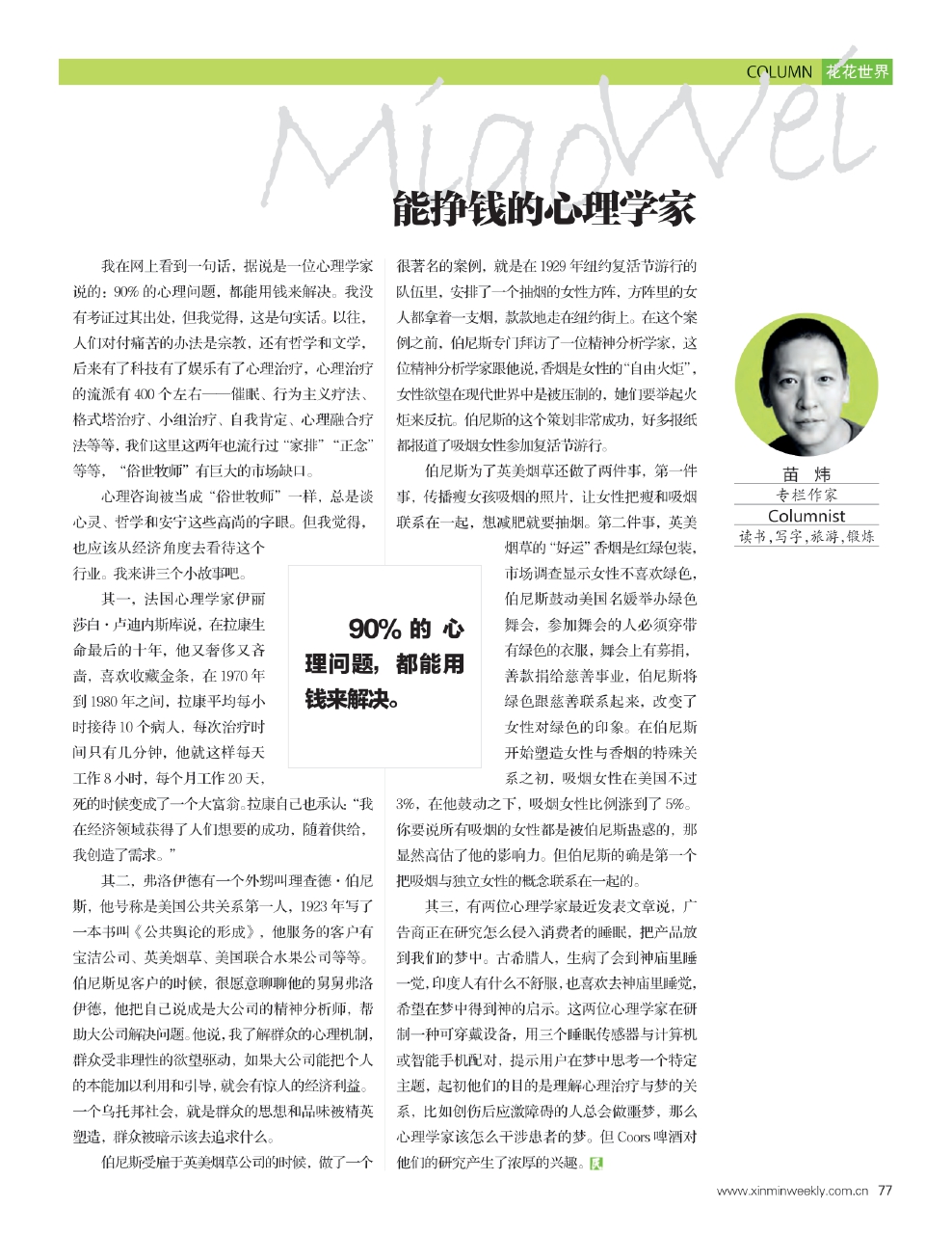 伯尼斯受雇于英美烟草公司的时候,做了一个很著名的案例,就是在1929年纽约复活节游行的队伍里,安排了一个抽烟的女性方阵,方阵里的女人都拿着一支烟,款款地走在纽约街上。在这个案例之前,伯尼斯专门拜访了一位精神分析学家,这位精神分析学家跟他说,香烟是女性的“自由火炬”,女性欲望在现代世界中是被压制的,她们要举起火炬来反抗。伯尼斯的这个策划非常成功,好多报纸都报道了吸烟女性参加复活节游行。