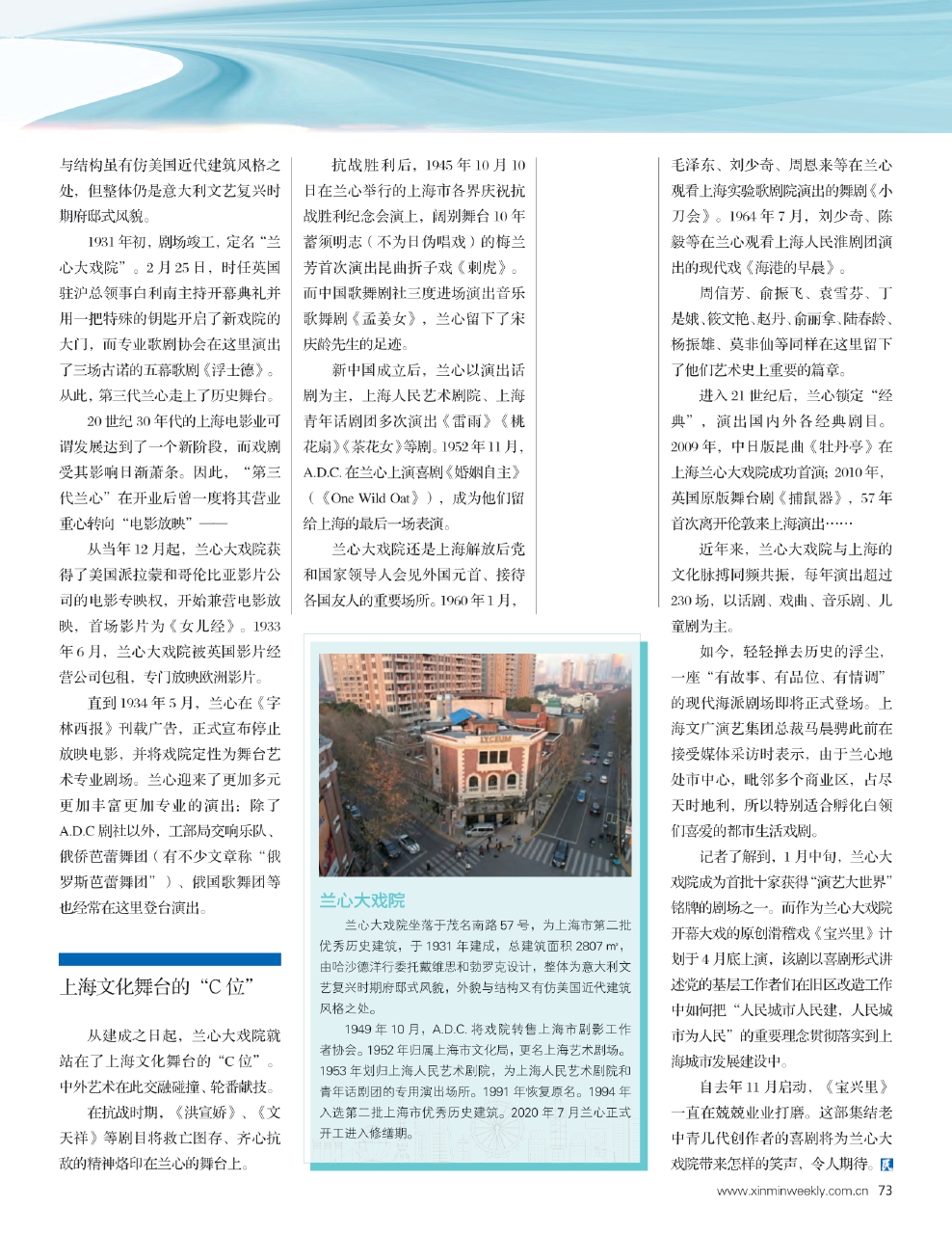 如今,轻轻掸去历史的浮尘,一座“有故事、有品位、有情调”的现代海派剧场即将正式登场。上海文广演艺集团总裁马晨骋此前在接受媒体采访时表示,由于兰心地处市中心,毗邻多个商业区,占尽天时地利,所以特别适合孵化白领们喜爱的都市生活戏剧。