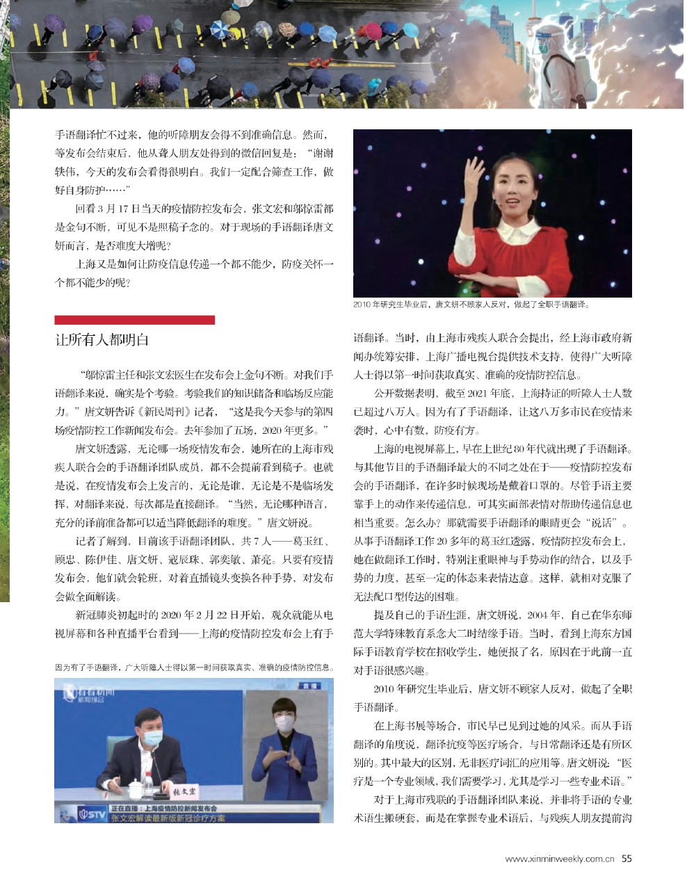 “邬惊雷主任和张文宏医生在发布会上金句不断。对我们手语翻译来说,确实是个考验。考验我们的知识储备和临场反应能力。”唐文妍告诉《新民周刊》记者,“这是我今天参与的第四场疫情防控工作新闻发布会。去年参加了五场,2020年更多。”