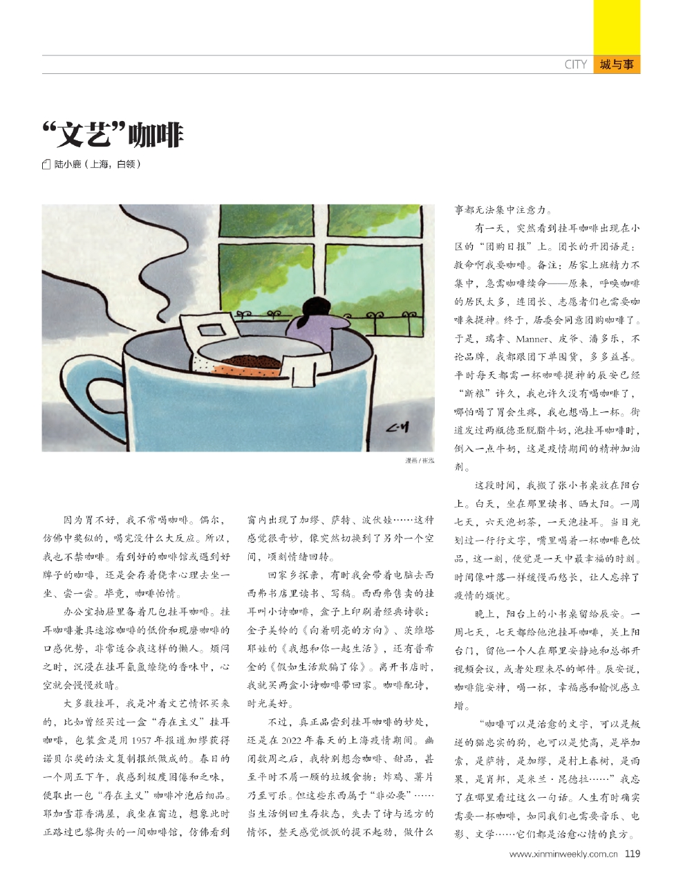 大多数挂耳,我是冲着文艺情怀买来的,比如曾经买过一盒“存在主义”挂耳咖啡,包装盒是用1957年报道加缪获得诺贝尔奖的法文复制报纸做成的。春日的一个周五下午,我感到极度困倦和乏味,便取出一包“存在主义”咖啡冲泡后细品。耶加雪菲香满屋,我坐在窗边,想象此时正路过巴黎街头的一间咖啡馆,仿佛看到窗内出现了加缪、萨特、波伏娃……这种感觉很奇妙,像突然切换到了另外一个空间,顷刻情绪回转。