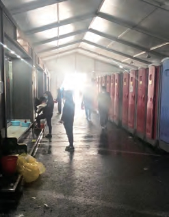 这里两个人一个隔间,发了一些洗漱用品,一包口罩,还有一个收纳柜、一个垃圾桶。口罩用完了可以问医生拿。生活垃圾也有人来收走。 我想住酒店有空调,所以最早就穿了一件呢大衣,带了三件短袖T恤出门了。但刚到世博的头两天,天蛮冷的,被子很薄。我把能穿的衣服都穿在身上,睡觉也把头埋进了被子里,因为这里的灯24小时开着。