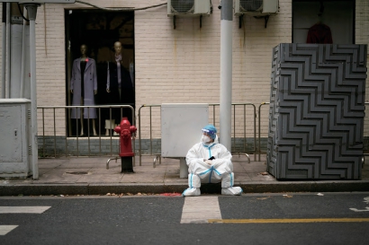 2022年4月16日,上海,一名身着防护服的防疫人员在街上休息。