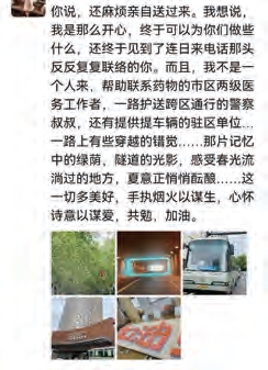 这份大爱的传递和接力,给了所有人力量,值得我好好守护。后来苏州队领队把他们工作群里对紧急送药的评论发给我,有一位医护写着:“特殊时期药物的特殊旅行,一种最特别、最温暖的力量。为上海付出,会值得!一起加油!”