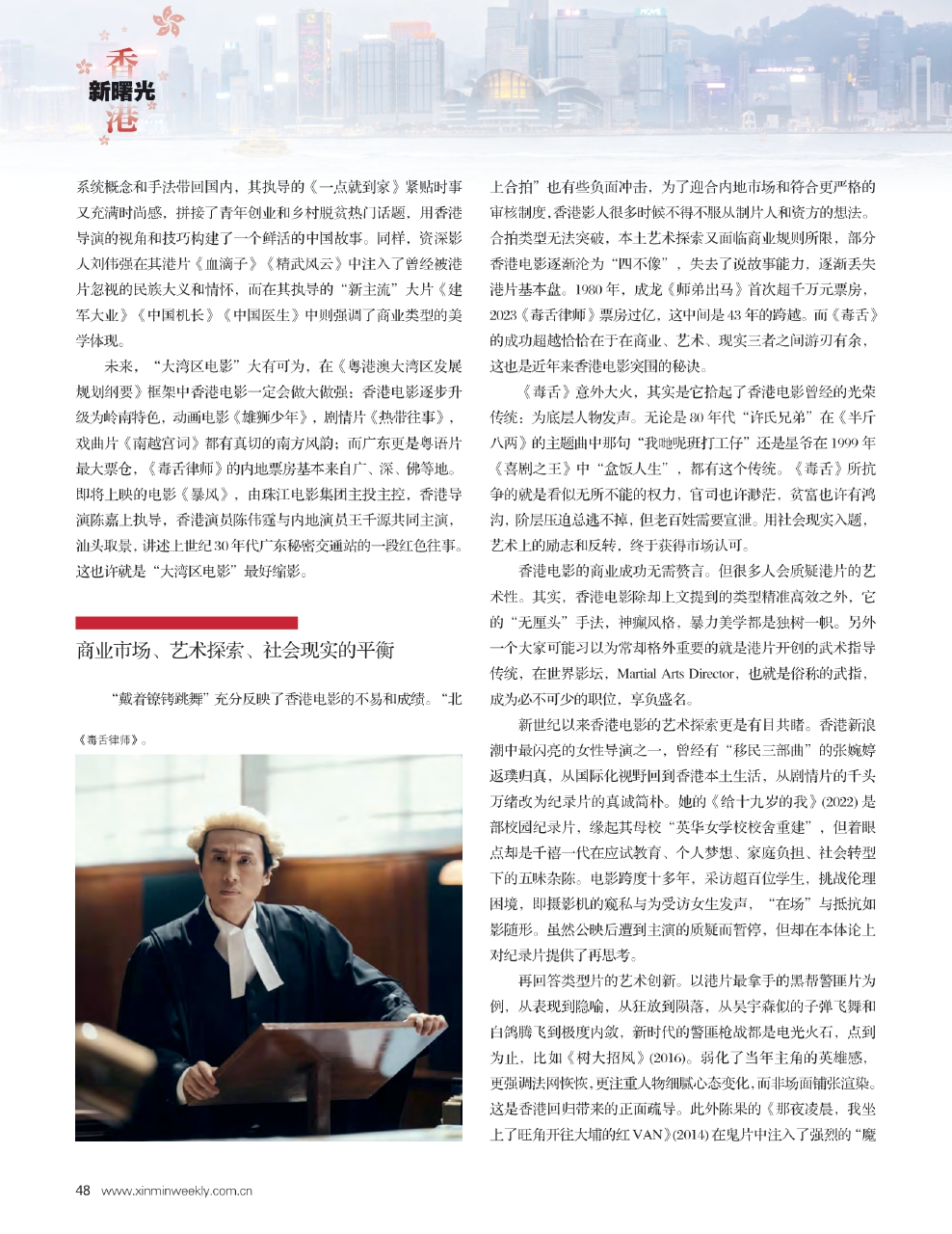 “戴着镣铐跳舞”充分反映了香港电影的不易和成绩。“北上合拍”也有些负面冲击,为了迎合内地市场和符合更严格的审核制度,香港影人很多时候不得不服从制片人和资方的想法。合拍类型无法突破,本土艺术探索又面临商业规则所限,部分香港电影逐渐沦为“四不像”,失去了说故事能力,逐渐丢失港片基本盘。1980年,成龙《师弟出马》首次超千万元票房,2023《毒舌律师》票房过亿,这中间是43年的跨越。而《毒舌》的成功超越恰恰在于在商业、艺术、现实三者之间游刃有余,这也是近年来香港电影突围的秘诀。