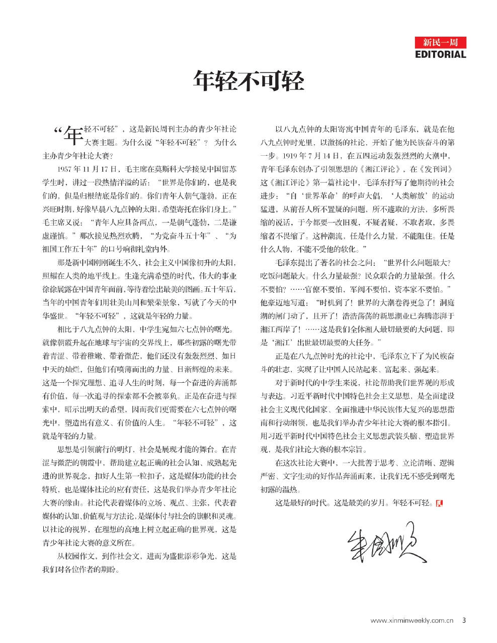 “年轻不可轻”,这是新民周刊主办的青少年社论大赛主题。为什么说“年轻不可轻”?为什么主办青少年社论大赛?