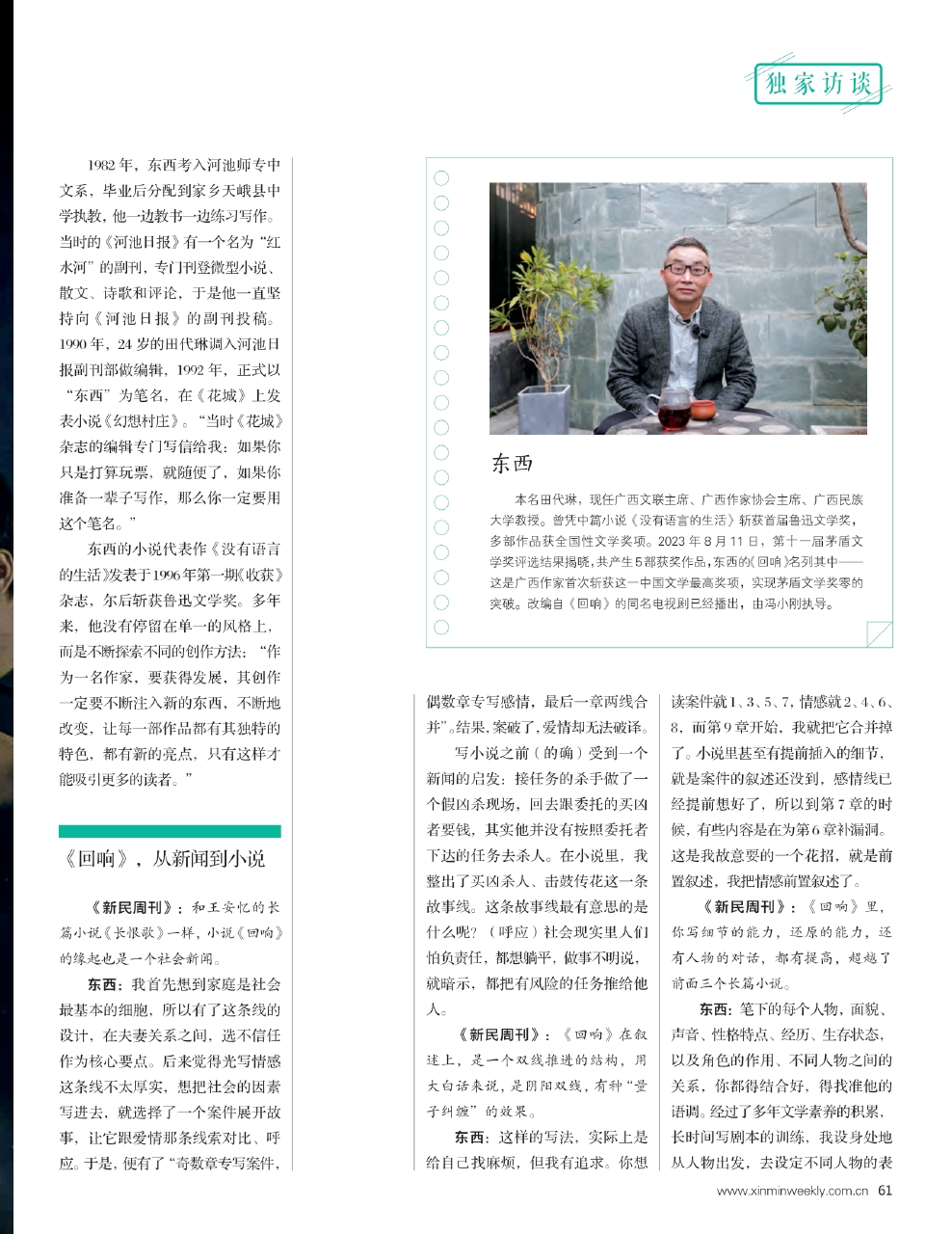 东西 本名田代琳,现任广西文联主席、广西作家协会主席、广西民族大学教授。曾凭中篇小说《没有语言的生活》斩获首届鲁迅文学奖,多部作品获全国性文学奖项。2023年8月11日,第十一届茅盾文学奖评选结果揭晓,共产生5部获奖作品,东西的《回响》名列其中——这是广西作家首次斩获这一中国文学最高奖项,实现茅盾文学奖零的突破。改编自《回响》的同名电视剧已经播出,由冯小刚执导。