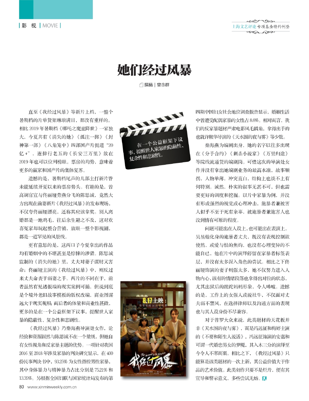 《我经过风暴》乃秦海燕导演处女作,论经验和资源固然与陈思诚不在一个量级,但她自有女性视角和反家暴主题的优势。一项针对我国2016至2018年涉及家暴的判决研究显示,在400份民事判决书中,93.25%为女性指控男性家暴,其中身体暴力与精神暴力占比分别是75.21%和13.35%。另根据全国妇联与国家统计局发布的第四期中国妇女社会地位调查报告显示,婚姻生活中曾遭受配偶家暴的女性占8.6%。相对而言,我们的反家暴题材严肃电影凤毛麟角,拿得出手的也就许鞍华导演的《天水围的夜与雾》等少数。