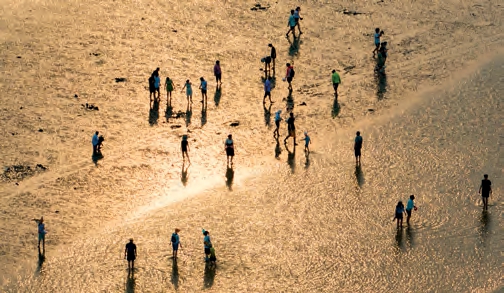 晨曦中,刚刚露出水面的一片沙洲,一群海鸟在从容觅食。