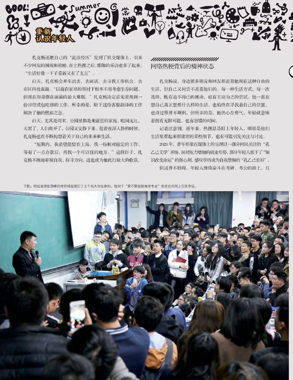 2023年,青年形象在媒体上的呈现以一部分网民关注的“孔乙己文学”开场,面对压力增加的就业形势,部分年轻人放下了“知识改变命运”的强心剂,感叹学历成为自我禁锢的“孔乙己长衫”。