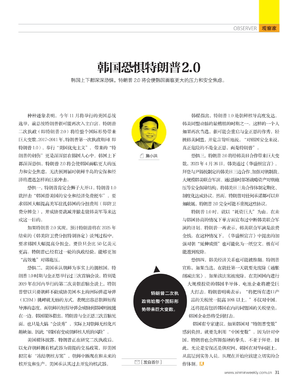 种种迹象表明,今年11月将举行的美国总统选举,前总统特朗普很可能再次入主白宫。特朗普二次执政(即特朗普2.0)将给整个国际形势带来巨大变数。2017~2011年,特朗普第一次执政期间(即特朗普1.0),奉行“美国优先主义”,带来的“特朗普的创伤”更是深深留在韩国人心中。韩国上下都深深恐惧,特朗普2.0将会使韩国面临更大的压力和安全焦虑。无法预测届时朝鲜半岛的安保和经济将遭遇怎样的巨浪冲击。