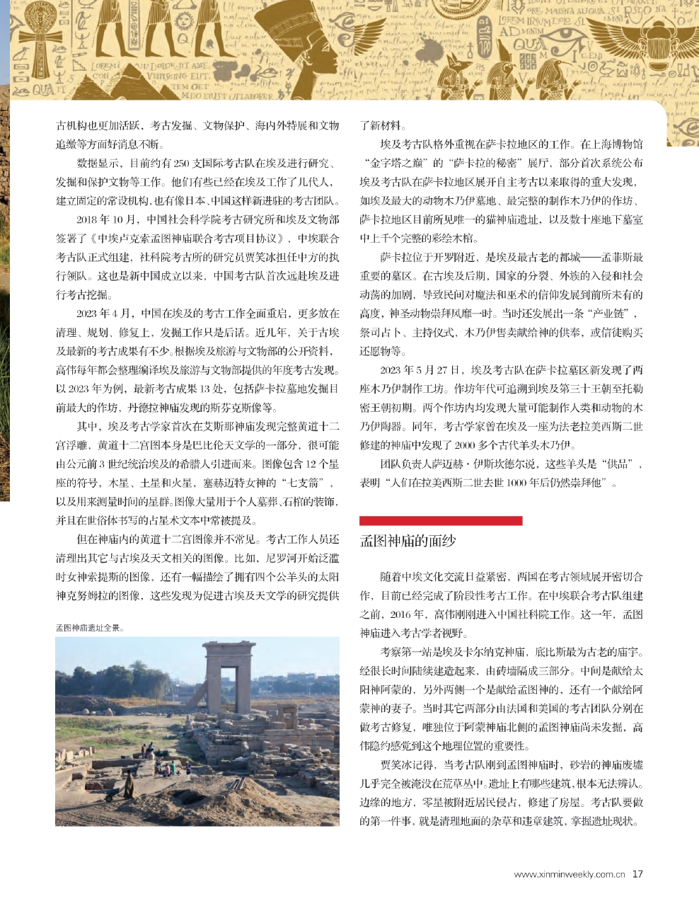 古埃及最新考古发现与研究成果有哪些?中埃联合考古的孟图神庙遗址何以与中华文明相通?两个古老文明的碰撞如何诠释人类命运共同体?中埃卡尔纳克北部孟图神庙联合考古项目中方总负责人、中国社会科学院考古研究所世界考古研究室主任贾笑冰和中国社会科学院考古研究所世界考古研究室助理研究员、中埃联合考古队的发掘成员之一高伟接受了《新民周刊》专访。