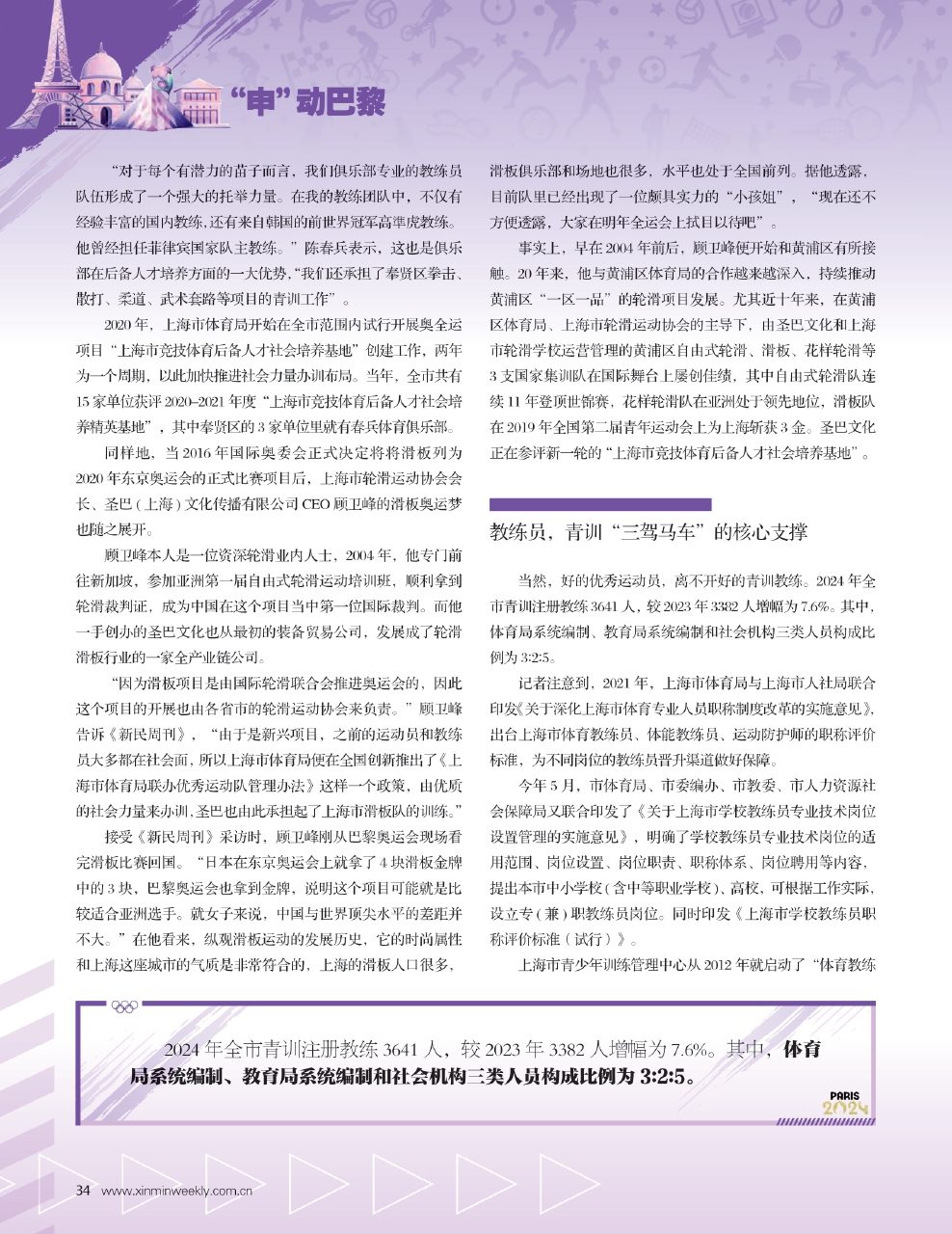 接受《新民周刊》采访时,顾卫峰刚从巴黎奥运会现场看完滑板比赛回国。“日本在东京奥运会上就拿了4块滑板金牌中的3块,巴黎奥运会也拿到金牌,说明这个项目可能就是比较适合亚洲选手。就女子来说,中国与世界顶尖水平的差距并不大。”在他看来,纵观滑板运动的发展历史,它的时尚属性和上海这座城市的气质是非常符合的,上海的滑板人口很多,滑板俱乐部和场地也很多,水平也处于全国前列。据他透露,目前队里已经出现了一位颇具实力的“小孩姐”,“现在还不方便透露,大家在明年全运会上拭目以待吧”。