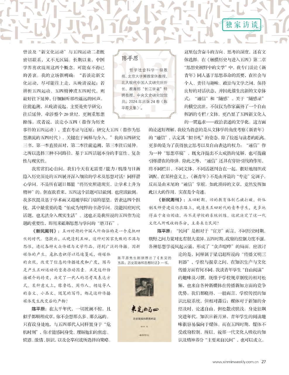 陈平原先生刚刚推出了《未完的五四:历史现场和思想对话》一书。