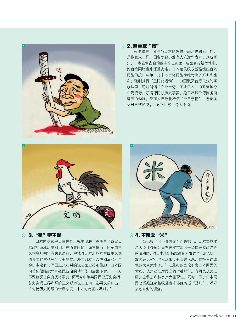 2.避重就“情” 赖清德称,台湾与日本的感情不是只像朋友一样,是像家人一样。国务院台办发言人陈斌华表示,众所周知,日本在霸占台湾的半个世纪里,所犯罪行罄竹难书,给台湾同胞带来深重灾难。日本殖民政权残酷镇压台湾同胞的抗日斗争,几十万台湾同胞为此付出了鲜血和生命;强制推行“皇民化运动”,力图泯灭台湾民众的国族认同;通过所谓“农业台湾、工业日本”的政策掠夺台湾资源。赖清德罔顾历史事实,绝口不提台湾同胞所遭受的劫难,反而大肆鼓吹所谓“台日感情”,粉饰美化日本殖民统治,背叛民族,令人不齿。