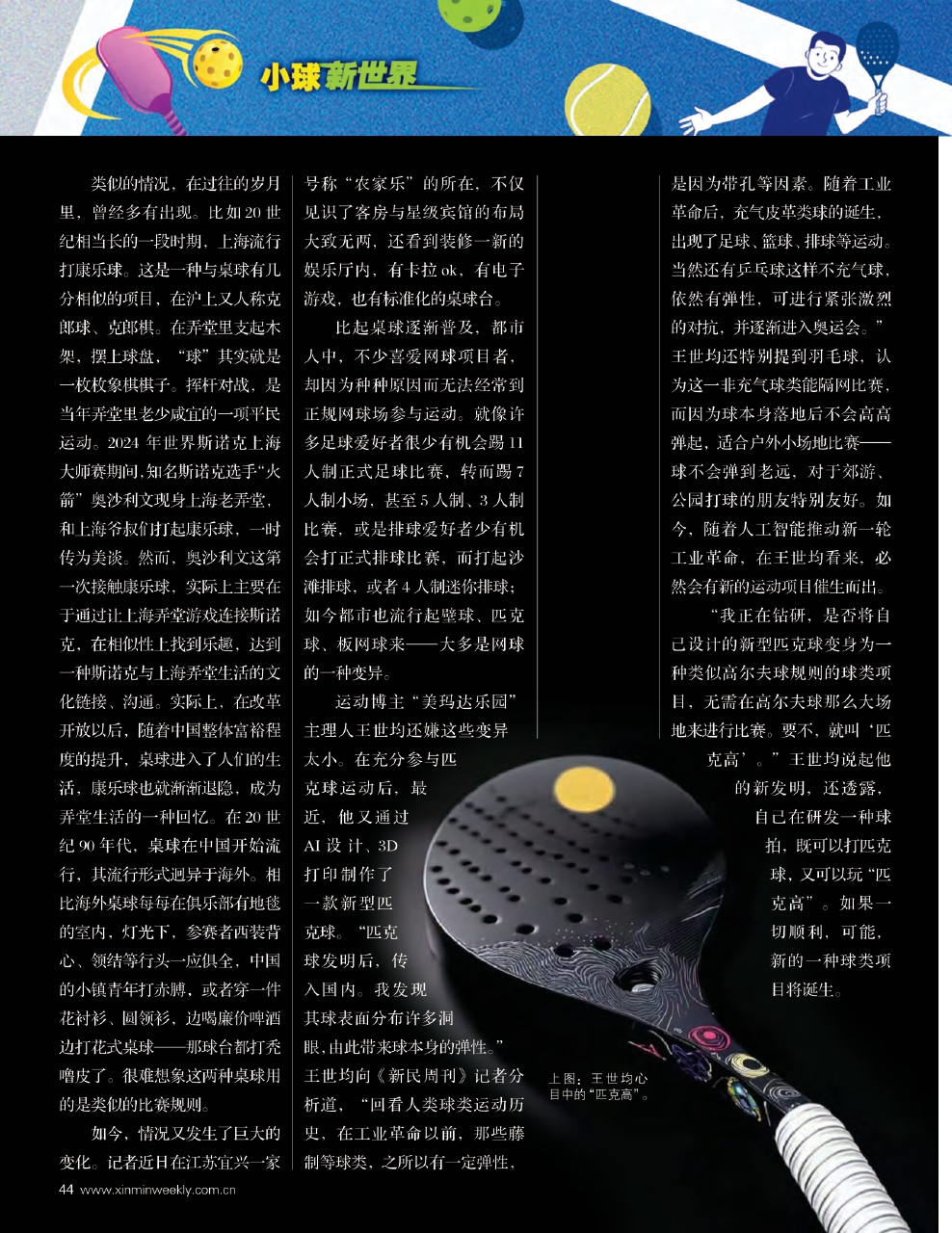 运动博主“美玛达乐园”主理人王世均还嫌这些变异太小。在充分参与匹克球运动后,最近,他又通过AI设计、3D打印制作了一款新型匹克球。“匹克球发明后,传入国内。我发现其球表面分布许多洞眼,由此带来球本身的弹性。”王世均向《新民周刊》记者分析道,“回看人类球类运动历史,在工业革命以前,那些藤制等球类,之所以有一定弹性,是因为带孔等因素。随着工业革命后,充气皮革类球的诞生,出现了足球、篮球、排球等运动。当然还有乒乓球这样不充气球,依然有弹性,可进行紧张激烈的对抗,并逐渐进入奥运会。”王世均还特别提到羽毛球,认为这一非充气球类能隔网比赛,而因为球本身落地后不会高高弹起,适合户外小场地比赛——球不会弹到老远,对于郊游、公园打球的朋友特别友好。如今,随着人工智能推动新一轮工业革命,在王世均看来,必然会有新的运动项目催生而出。