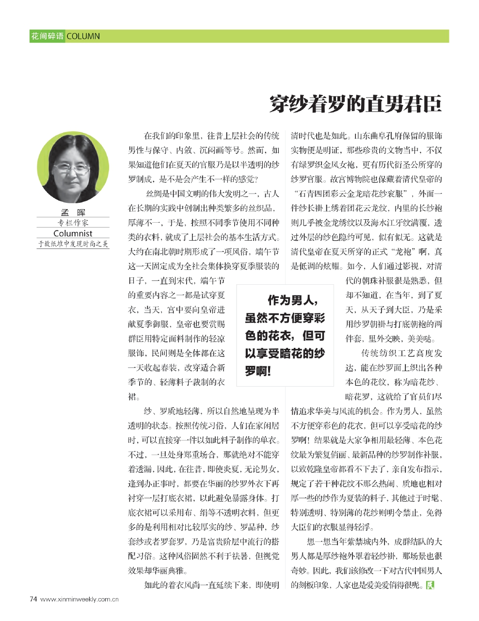 想一想当年紫禁城内外,成群结队的大男人都是厚纱袍外罩着轻纱褂,那场景也很奇妙。因此,我们该修改一下对古代中国男人的刻板印象,人家也是爱美爱俏得很呢。