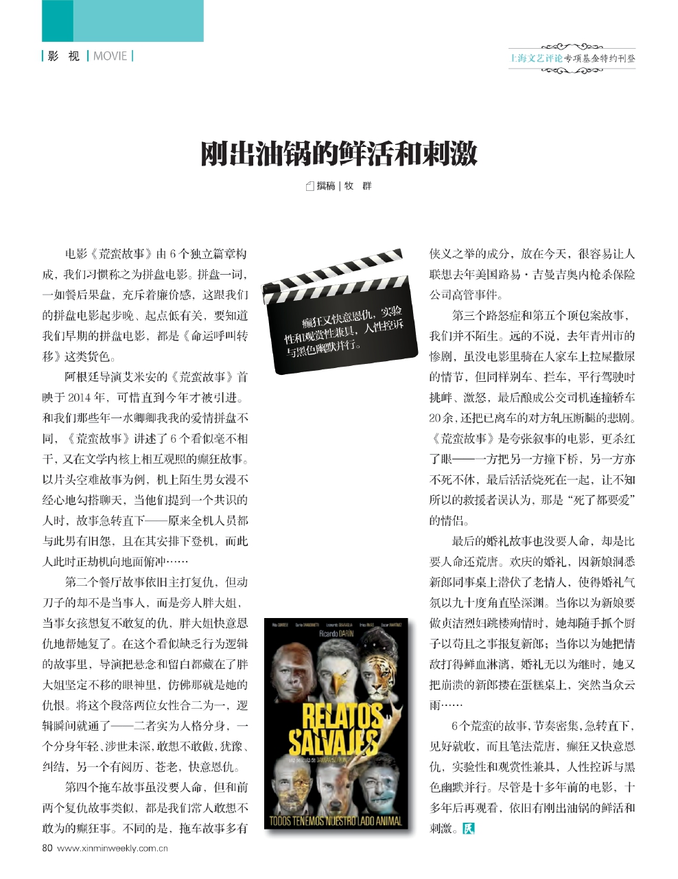 电影《荒蛮故事》由6个独立篇章构成,我们习惯称之为拼盘电影。拼盘一词,一如餐后果盘,充斥着廉价感,这跟我们的拼盘电影起步晚、起点低有关,要知道我们早期的拼盘电影,都是《命运呼叫转移》这类货色。